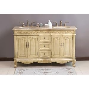 Product Description : LD-1020T Vanity Top Finish: Travertine Faucets Not Included Features: -Double bathroom vanity.-Three holes.-Comes with 18'' undermount ivory ceramic bowls.-Holes are pre-drilled for standard 8'' center faucets.-Features three functional drawers in the middle of the cabinet.-On each side of the drawers are two doors, which conceal storage with shelves.-The drawers and doors have brass pulls, knobs, and hinges.-Door panels are trimmed with raised resin patterns.-Resembles antique-style hand carvings.-Additional raised patterns can be seen under the stone top and extend from end to end and around the sides.-Stunning four door storage with shelves and three drawers.-Big back cutout for easy plumbing installation. Construction: -Solid birch construction. Color/Finish: -Antique ivory finish.-The lower apron of the cabinet has carved patterns, which accent the carved feet.-Baltic brown finish.-Travertine finish. Dimensions: -Overall dimensions: 36'' H x 58'' W x 22'' D.