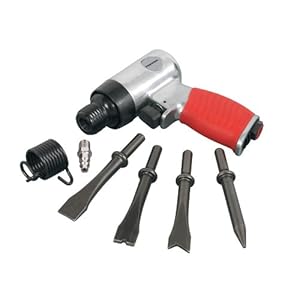 Product Description : From the ManufacturerDie Cast Aluminum Body, Variable Speed Drive, Non-Slip Cushion Grip Handle , Spring-Type Tool Retainer , Chrome Molybdenum Steel Chisels, Blows per Minute: 4500, Bore: 3/4", Stroke: 1-5/8" , Chisel Shank: .401. Contents: 1-pc. Air Hammer, 1-pc. Tool Retaining Spring , 1-pc. Male Quick Connector, 4-pc. 5" Chisels: Flat Chisel, Weld Breaker, Cutting Chisel, and Tapered Punch Product Description : MIT 7-PC. 150MM AIR HAMMER SET features: Aluminum Alloy Body with Pistol Grip Handle, Spring-Type Tool Retainer, Ideal for Cutting, Shearing, and Punching, Built-in Air Regulator Varies Speed and Power, Chrome Molybdenum Steel Chisels,401" Shank, Blows per Minute: 4500, Bore: 3/4", Stroke: 1-5/8", Working Air Pressure: 90 psi, Average Air Consumption: 4 CFM, Air Inlet: 1/4", Minimum Air Hose Size: 3/8", 1-pc. 150mm Air Hammer, 1-pc. Tool Retaining Spring, 1-pc. Male Quick Connector, 4-pc. Chrome Molybdenum Steel Chisels: Long Blade Panel Cutter, Ripping Chisel, Rivet Cutter and Tapered Punch