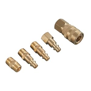 Product Description : From the ManufacturerThe TEKTON 5-piece quick coupler set is perfect for changing air tools and accessories faster. Set features a rugged solid brass construction that is precision machined for leak-proof operation. One-touch connecting and disconnecting of tools and accessories allows for quick and easy change. Fitting rotates to eliminate twisted hoses. Couplers are universally fit for 1/4-Inch NPT tools and have a 90 day guarantee. Set includes: 1-piece female quick coupler; 1-piece Female connector; 2-piece male connectors; 1-piece nipple. Product Description : MIT 5-PC. BRASS QUICK COUPLER features: Heavy-Duty Solid Brass Construction, Precision Machined for Leak-Proof Operation, Quickly Locks Tools onto Air Hoses, Coupler Assures Easy Connects and Disconnects, Fittings Rotate to Eliminate Twisted Hoses, Universal Fit for 1/4" NPT Tools, 1-pc. Female Quick Coupler, 1-pc. Female Connector, 2-pc. Male Connectors, 1-pc. Nipple