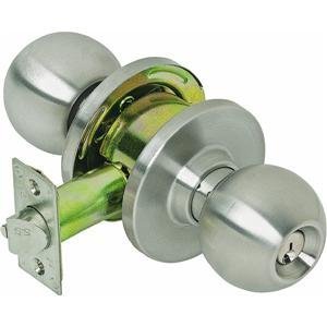 Product Description : (KC2386). Heavy duty commercial storeroom ball knob. Satin stainless steel (US32D). Performance: Complies with ANSI A156.2. Series 4000, Grade 2 (400,000 cycles). UL listed for 3 hour fire door. Keying: 6 or 7 pin SCC keyway with 2 nickel keys per lock. Door range: 1 3/8'' to 1 3/4''. Backset: 2 3/4'' standard. Strike: T strike (1 1/8'' x 2 3/4'') standard. Cylindrical, steel coated with zinc dichromate (corrosion resistance). Latch operated by rotating inside knob or key in outside knob. Outside knob always fixed.