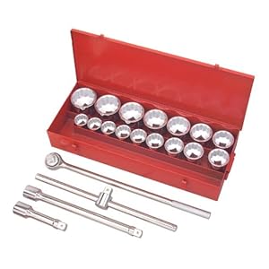 Product Description : From the ManufacturerDrop Forged, Heat Treated Carbon Steel Construction, Corrosion-Resistant Chrome Plated Finish, Tapered-End, 12-Point Sockets with Lock-On Notched Drive End , 43-Tooth, Knurled-Grip Ratchet Handle with Lock-On Drive Tang. Product Description : Features a heavy duty metal carry case for organized storage of all components, 1-pc. 25" ratchet handle, 1-pc. 8" extension bar, 1-pc. 18" extension bar, 1-pc. 22" sliding T-bar, 16-pc. 1"-Dr. 12-point sockets (SAE): 1-5/8, 1-11/16, 1-3/4, 1-13/16, 1-7/8, 2, 2-1/8, 2-3/16, 2-1/4, 2-3/8, 2-1/2, 2-5/8, 2-3/4, 2-15/16, 3, 3-1/8", 1-pc. Heavy Duty Metal Carry Case.