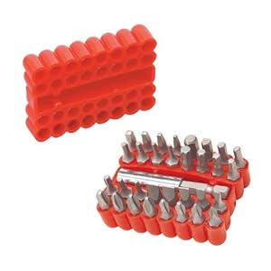 Product Description : From the ManufacturerFeaturing the most common size screwdriver bits, the TEKTON 33-Piece Screwdriver Bit Set is a must have for contractors, homeowners and DIYers. Nearly every bit needed for home improvement projects is included in the set. Bits are constructed from sandblasted chrome vanadium steel and are heavy-duty enough to stand up to the toughest jobs. The tips are precision-milled for exact fit. They fit 1/4-inch hex shanks. The screwdriver bit set has a quality guarantee. TEKTON - Meet your new old reliable. Set Includes:(1) 2-5/16-Inch Magnetic Bit Holder; (1) Bit Organizer; (32) 1-Inch Screwdriver Bits: (5) Flat: 1/8, 5/32, 3/16, 1/4, 9/32-Inch; (6) Phillips: #0, #1, #2 (3x), #3; (7) Star: SD-10, SD-15, SD-20, SD-25, SD-27, SD-30, SD-40;(8) Hex: 3/32, 5/64, 7/64, 1/8, 9/64, 5/32, 3/16, 1/4-Inch; (4) Square: S-0, S-1, S-2, S-3; (2) Drywall: #2 (2x) Product Description : Sandblasted chrome vanadium steel. 32 Piece 1 inch screwdriver bits sizes: flat: 1/8, 5/32, 3/16, 1/4, 9/32 inch Phillips: Number 0, 1, 2 (3 piece), Number 3 drywall: Number 2 (2 piece) star: sd-10, sd-15, sd-20, sd-25, sd-27, sd-30, sd-40 square: s-0, s-1, s-2, s-3 hex: 3/32, 5/64, 7/64, 1/8, 9/64, 5/32, 3/16, 1/4 inch. 1 Piece 2-5/16 inch magnetic bit holder